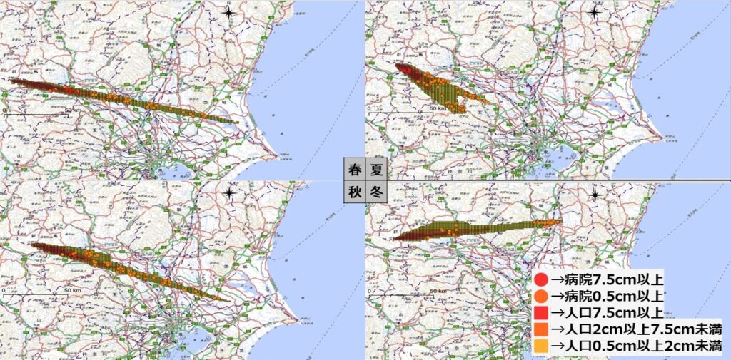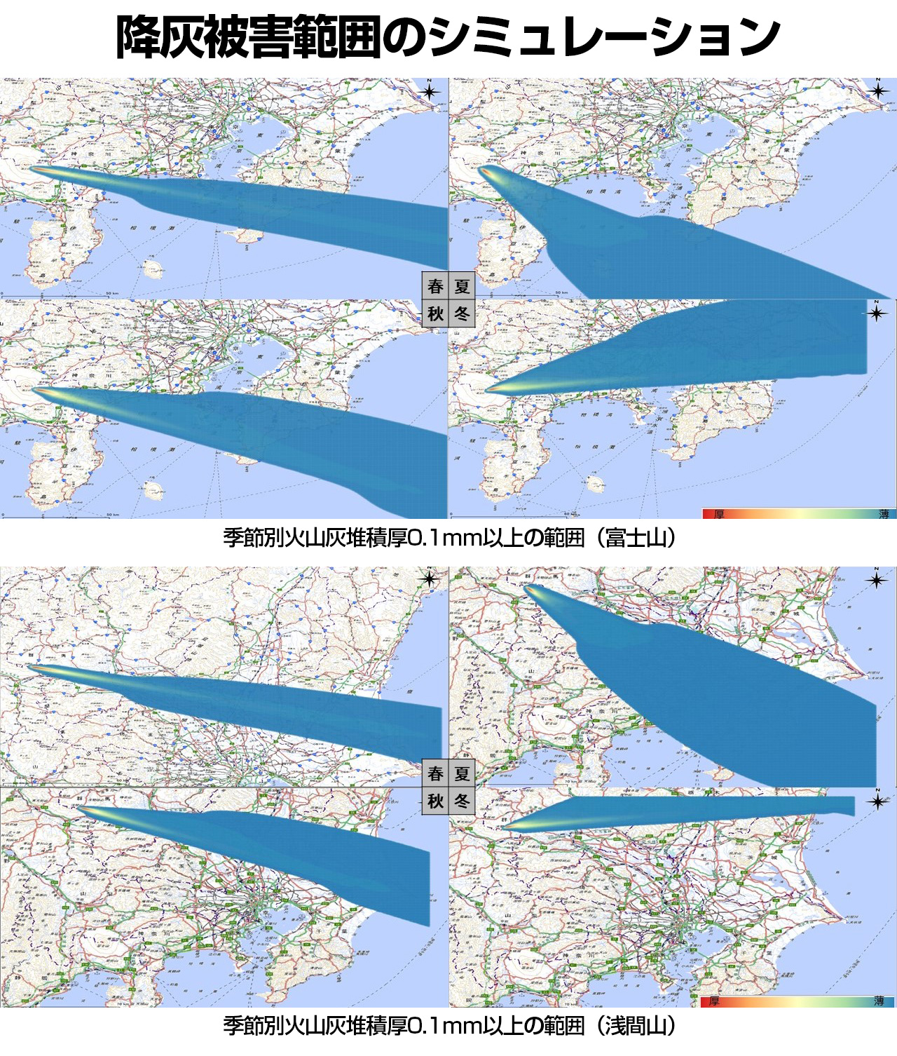 本作品は、活火山の中でも”富士山”と”浅間山”を対象に、Tephra2を用いて季節ごとに風向・風速の条件を設定し